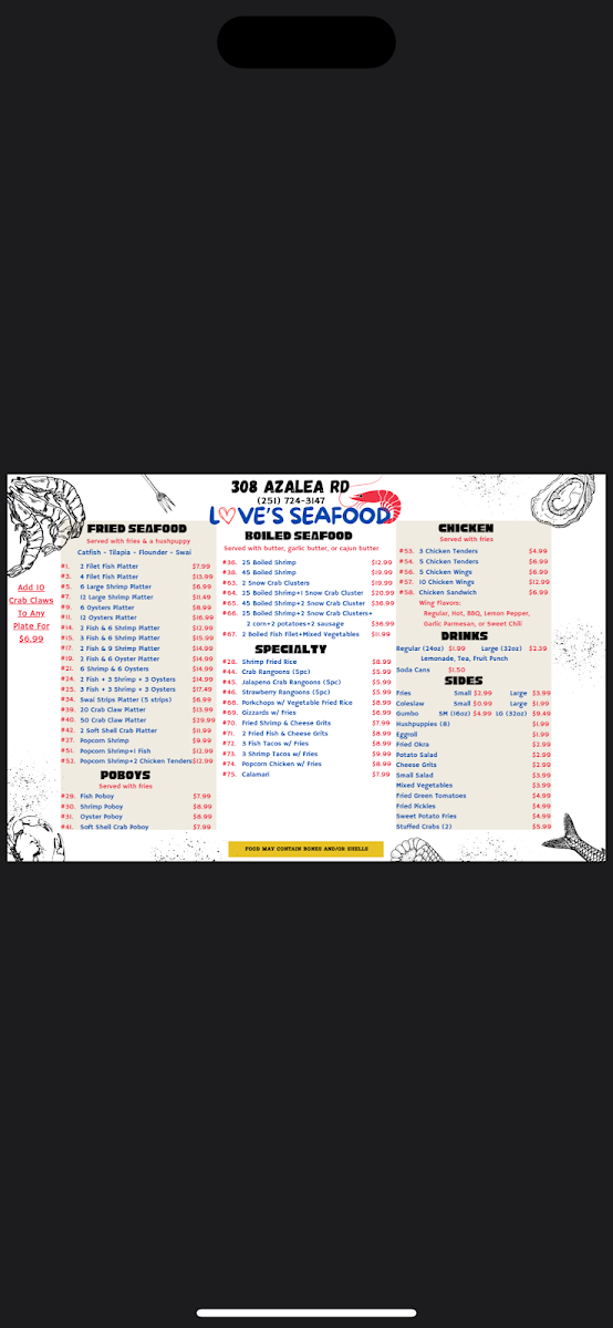 Love's Seafood on Azalea Road offers a diverse and flavorful menu, specializing in both fried and boiled seafood options. For those craving fried dishes, the 2 Filet Fish Platter, 4 Filet Fish Platter, and 6 Large Shrimp Platter provide a satisfying choice, with platters such as the 12 Large Shrimp Platter and 6 Oysters Platter elevating the experience. The boiled seafood section is just as enticing, featuring 25 Boiled Shrimp, 45 Boiled Shrimp, and combinations like the 25 Boiled Shrimp + 1 Snow Crab Cluster or the 45 Boiled Shrimp + 2 Snow Crab Clusters, catering to larger appetites.